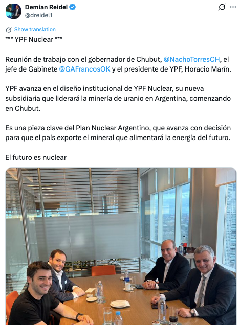 En esta fiesta de pizza con champagne y reactores nucleares, Reidel aparece con el gobernador de Chubut, Ignacio Torres, y el presidente de YPF, el roquista Horacio Marín, creando YPF Nuclear, que se enfocaría en la minería de uranio para exportación.
